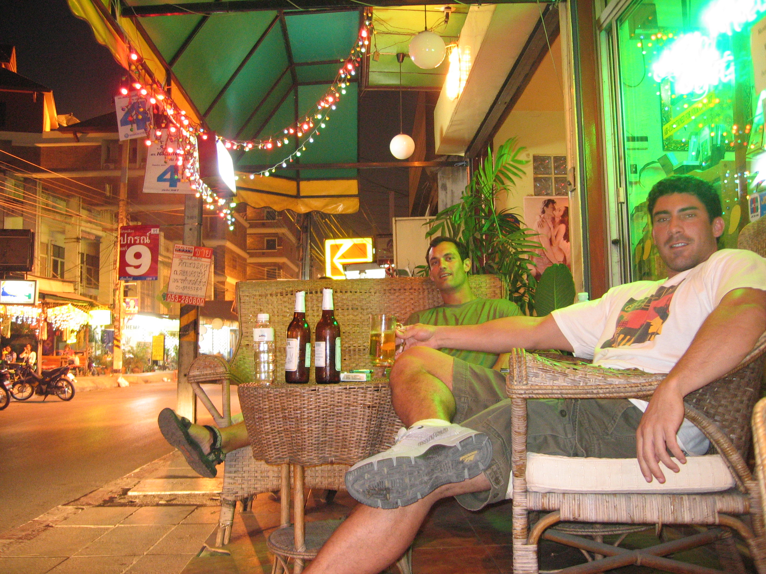 These two English girls (left) shame us, as they are traveling for two years straight. Incidentally, the arc on the glasses-wearing girl's left arm is from my laser pointer, which fascinated the bartender, and the girl next to me was obsessed with how great her newly-purchased breasts were (even after Keith and I both disparaged them as frauds). Anyway, we tagged along with Ryan and his English friends to the Roof Top Bar, which was a very interesting place (below left). You had to leave your shoes on the second floor and climb a ladder to get to the roof top, where you sit on the floor (on pads) in colorful surroundings. We said goodbye to Ryan, left the English girls passed out (bottom right), and found a pool bar with more Brits to hang out with.