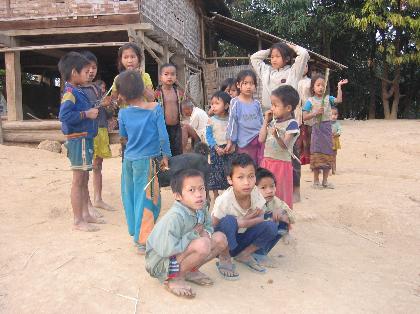 We left Muang Ngoi to visit a Hmong hill tribe village on an overnight trek. We reached the village after a brutal, six-hour uphill hike. The village consisted of 10-12 huts and was overrun with cute, but filthy, kids (and dogs), playing on the dusty mountaintop among chickens and pigs. The villagers, especially the kids, looked at us like we were aliens. Despite their initial apprehensiveness, our digital cameras, friendly cries of “Sabaidee!” (hello), and our judicious use of a laser pointer warmed them up.