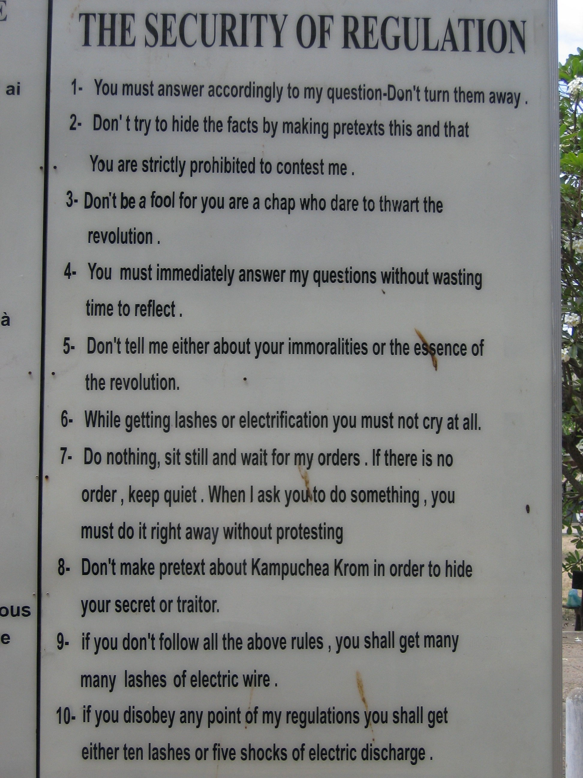 Fear was a prevailing motivator in the regime, and S-21 was instrumental in this. You did not want to get sent to S-21. Prisoners were comprised of engineers, technicians, intellectuals, teachers, students, etc. Whole families of the prisoners, including newly born babies, were taken there en masse to be exterminated.