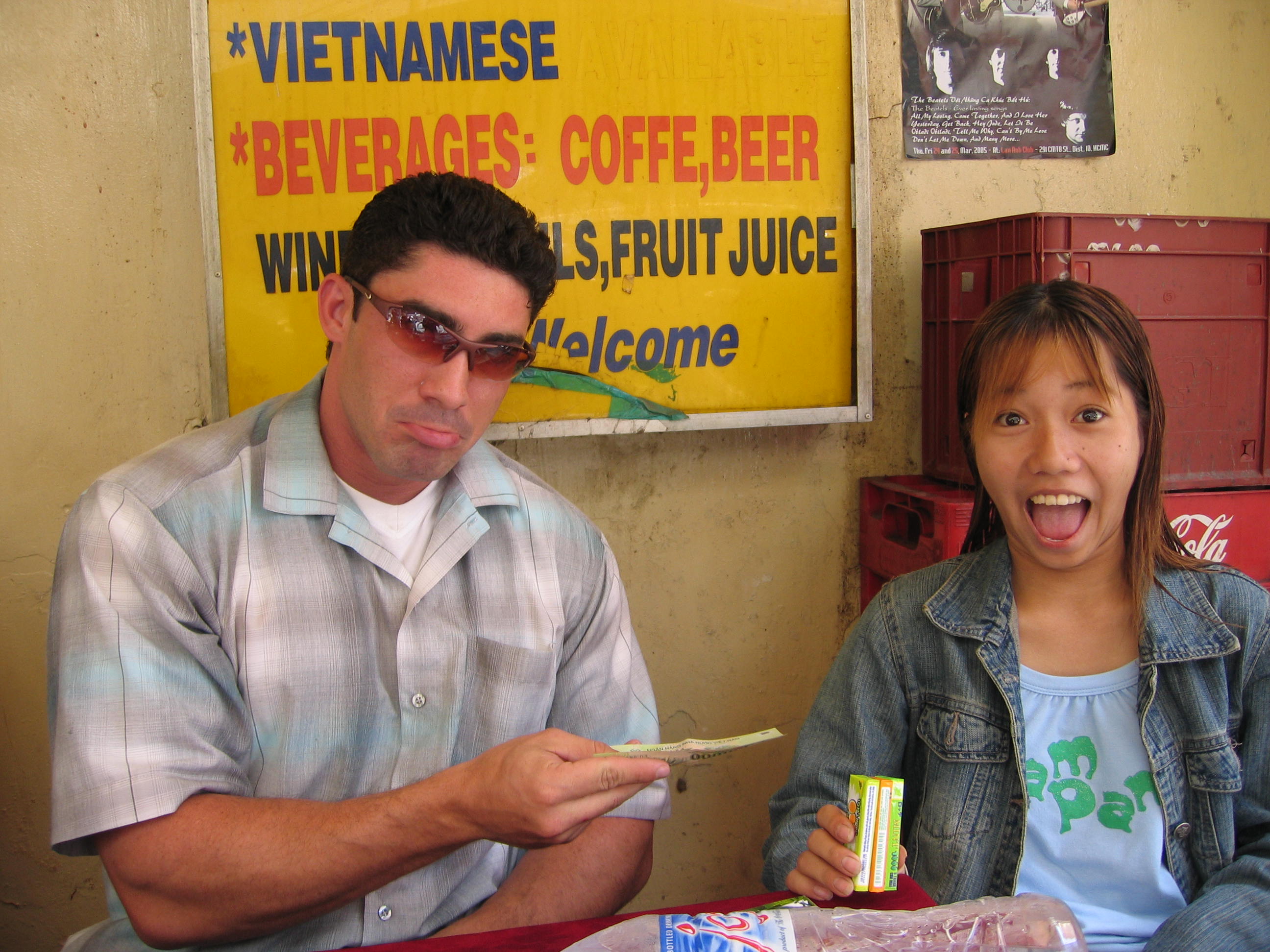 The kids here are bright. When I refused to buy postcards or gum from this girl, she challenged me to a game of Ro-Sham-Bo (sp?)—first to five. If I won, she’d give me three sticks of gum free, but if she won, I would have to buy three sticks. Of course I had to accept, and she edged me 5-4. After this crushing defeat, she gave each of us a coupon (stamped with her initials) for a free drink at a nearby bar, explaining: “Just take and get free drink. I get 5000 Dong, you get free drink. You can leave and bar lose, but we all win, no?” Impressive logic.